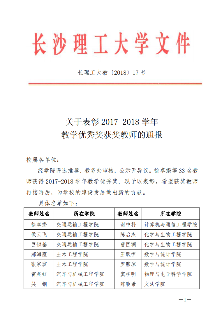 关于表彰2017-2018学年教学优秀奖获奖教师的通报