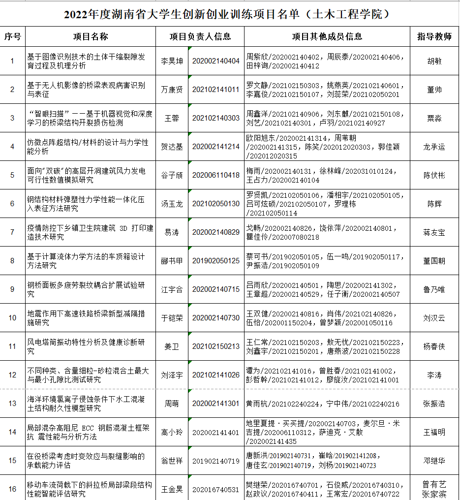 2022年土木工程学院共立项"2022年度湖南省大学生创新创业训练计划项目"16项。