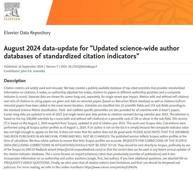 该榜单基于Scopus数据库的引用数据系统分析,以被引数(区分自引和他引,提供自引数据)、H指数、HM因子等6种综合指标 (composite score,C-score),根据 “生涯影响力”和“年度影响力”从近700万名科学家中遴选出世界排名前2%的科学家,分为22个领域和176个细分子领域。“全球前2%顶尖科学家榜单”分为“终身科学影响力榜单”(关注整个学术生涯迄今的影响力)和“年度科学影响力榜单”(聚焦上一年度的学术成就)。