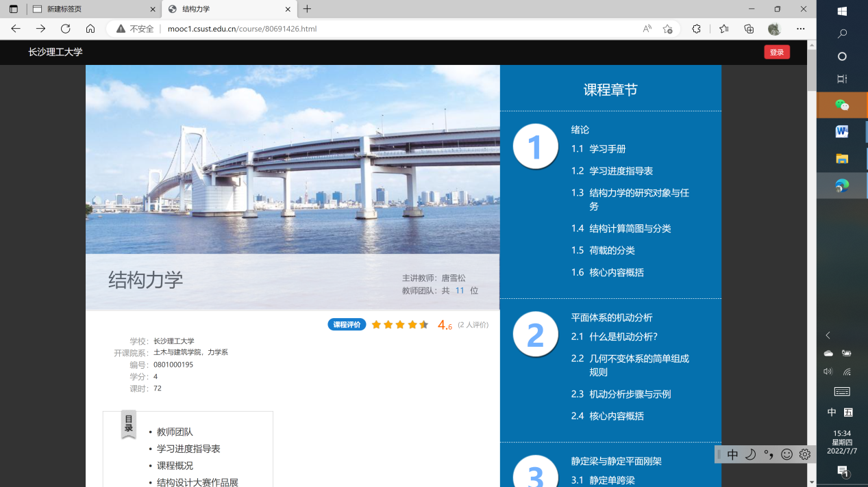 结构力学课程,2014年成为威廉体育williamhill首门建成并投入使用的慕课课程,2018年成为门批湖南省精品在线开放课程。