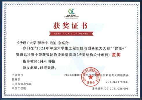 获2021年中国大学生工程实践与创新能力大赛金奖(智能+赛道桥梁设计项目全国冠军)