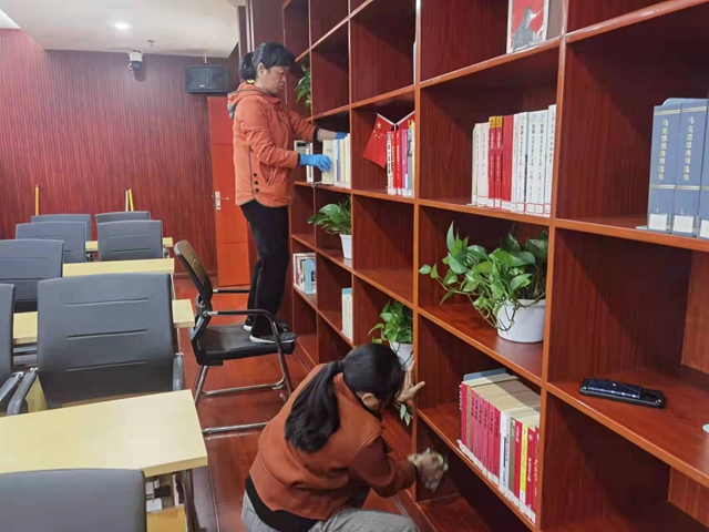 活动下半程,全体党员打扫整理云影文化传播中心会议室,为迎接下周二即将举办的“一校一书”读书分享会做准备。大家一边商讨调整布置方案,一边齐心合力、积极劳动。经过清扫和重新摆放的会议室干净整洁,焕发新貌。