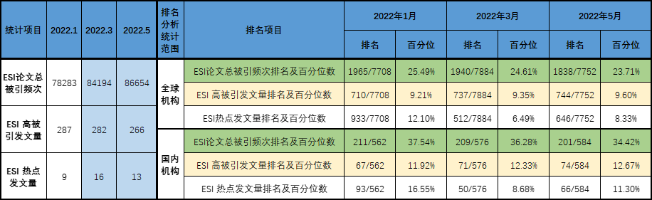 1)威廉体育ESI论文总被引频次近三期持续增加。其中,2022年3月比1月增加5911次,增幅为7.55%;2022年5月比3月增加2460次,增幅为2.92%。
