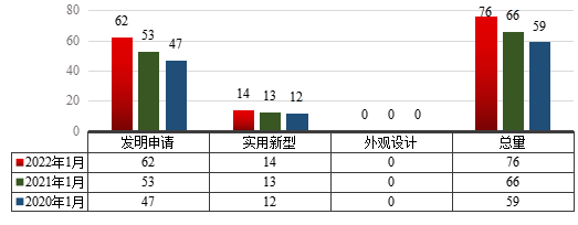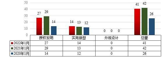 图1 2022年1月威廉体育专利申请类型分布及近两年同期申请情况