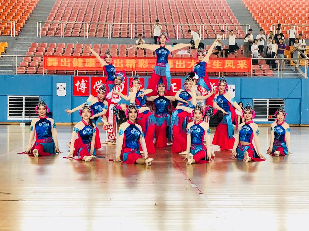 比赛在欢快的氛围中拉开了序幕,跳跃的音符演奏着青春的活力,动人的舞步展现着青春的风影,点燃了全场的热情。第一项器械健身操舞比赛,同学们通过扇子、爵士棍、毛巾、易拉罐、篮球等轻器械进行动作的编排,增加了比赛的趣味性和可看性。第二项排舞比赛,将中国风的《中国脊梁》展现出了铿锵有力而又柔和温婉的特点,表演精彩绝伦,收获了满场的阵阵掌声。在第三项啦啦操的比赛中,显示了大学生们充满活力,时尚、健康向上的美好。大学生优美的舞步成为赛场上靓丽的风景线,各参赛队伍以饱满的激情和活力展现了威廉体育学生蓬勃的朝气与拼搏的力量。