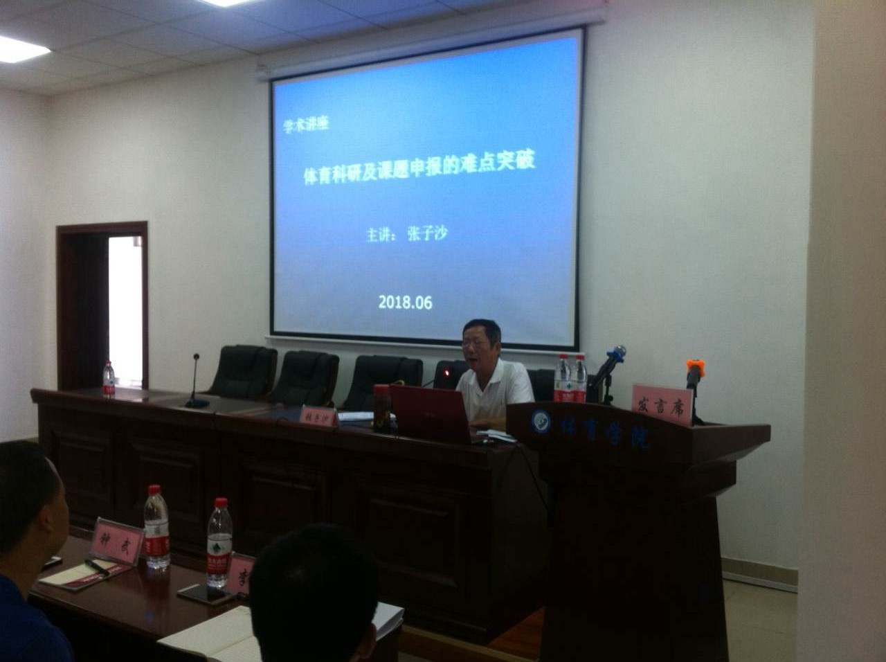 2018年6月27日下午,在云塘体育馆多媒体报告厅,原湖南大学体育学院党总支书记张子沙教授为我院教师做了题为“体育科研及课题申报的难点突破”讲座。讲座由学院院长张恳教授主持,学院党总支书记章罗庚教授,副院长钟武、李龙和潘红玲以及学院近40名教师参加了此次学术报告。