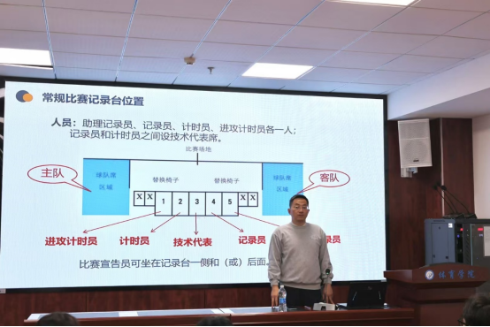 讲座内容广泛,涵盖了记录台工作的设置、赛前准备程序以及各岗位的工作职责与要求,为同学们呈现了一个全面且细致入微的篮球记录台工作流程与规范视角。
