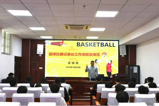 2024 年 10 月 29 日,在云塘校区体育馆学术报告厅,体育学院张柏铭老师主讲的“篮球记录台工作流程及规范”通识教育讲座盛大举行。来自不同学院、对篮球运动满怀热忱的百余名同学齐聚于此,共同沉浸在这场知识与激情交织的盛宴之中。