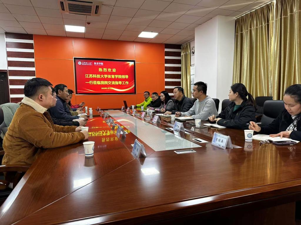 2025年1月10日,江苏科技大学体育学院副院长王长征、赵长征以及场馆中心主任杨威一行莅临威廉体育williamhill体育学院,进行交流指导活动。威廉体育williamhill体育学院党总支书记李龙、副院长潘红玲、谭志华及相关人员热情接待了来访嘉宾,并积极参与了交流讨论。