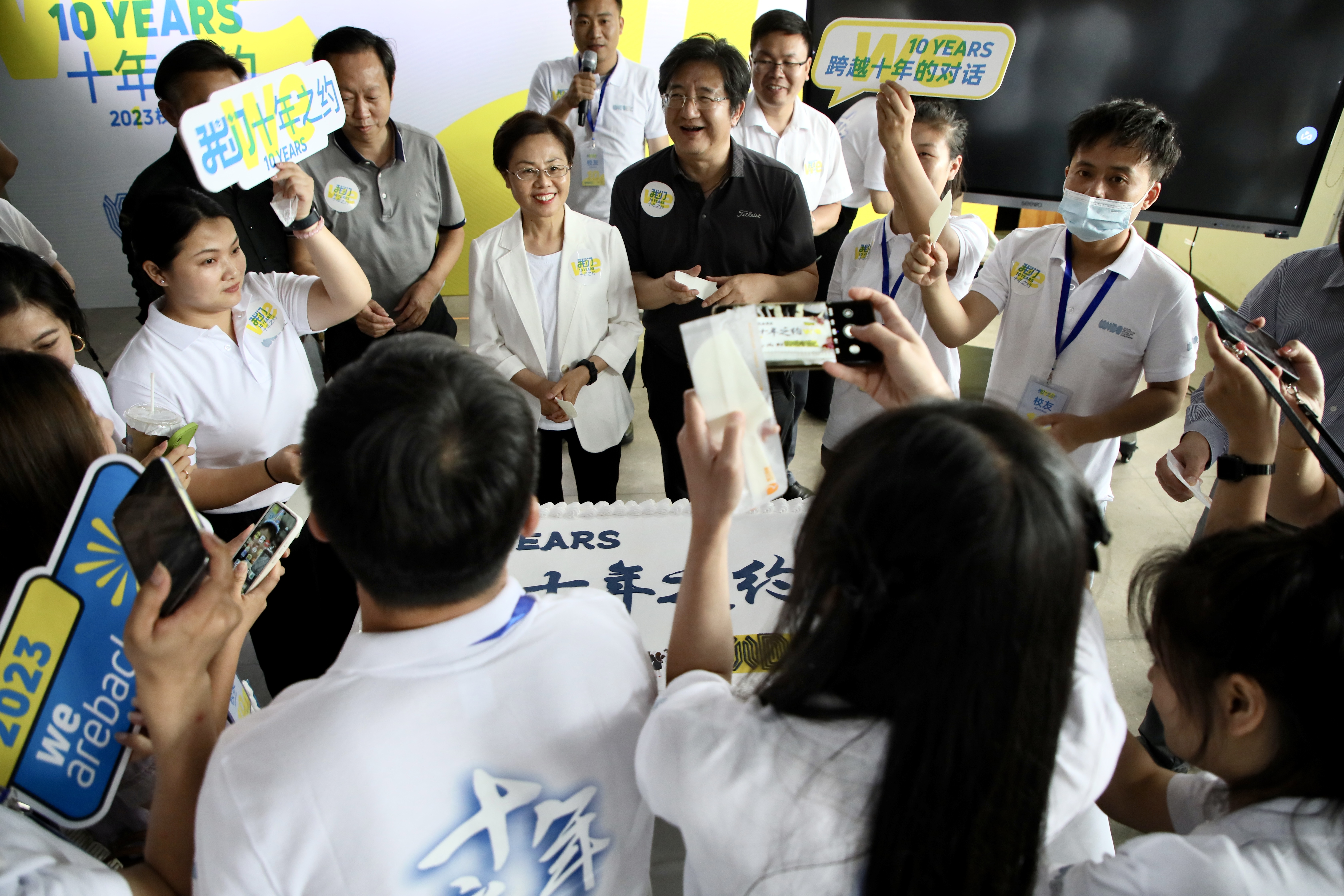 会议尾声,与会领导和全体校友共同切下“十年之约”纪念蛋糕,祝愿学校和全体校友、师生越来越好,期待下一个十年再相聚。