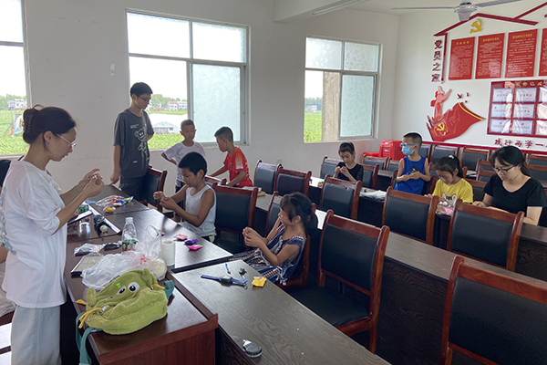 返乡大学生在“留守儿童补习班”教小朋友们做手工。