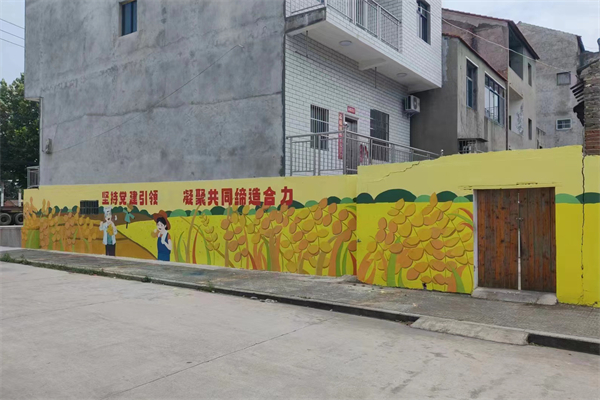 在荆州市监利市程集镇新兴垸村和姚集村,来自环境设计学院的“美丽家园·共同缔造”——筑梦服务队监利分队的同学们,根据当地的金草帽水稻种植、油菜花种植等农业产业特色,绘制了水稻和油菜花从种植到收获的不同场景,生动展现了当地产业特色。