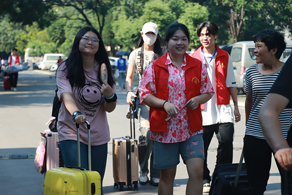 记者看到,从新生进校到大学生活动中心,各学院迎新点标识清晰、整齐有序,现场志愿者们热情周到、有问必答,有忙必帮。为了让来自全国各地的小萌新和家长们感受到“武设人”的热情,今年,校团委志愿服务点不仅提供行李搬运服务,还第一次采用全程导游讲解的形式,带领新生报到并游览校园。