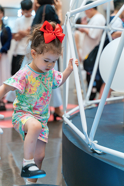“amazing”“interesting”,只见来自爱尔兰的Michael带着两岁半的萌娃开启了一场“星空旅程”。孩子站在作品《H@lo 圈》装置踏板上,群星闪烁,形成不同的星座图像,仿佛置身于浪漫星空下,吸引着萌娃爱不释“脚”。“妈妈快看,这花会呼吸。”作品《Cyblow 生态之光》深受市民喜爱,观众对着气体感应装置不停地大口呼气,就可以助力花朵绚烂绽放。据策展秘书、公共艺术学院教师黄雅丽介绍,这件作品想要表达的主题就是人的呼吸离不开植物,人的生命离不开自然界。