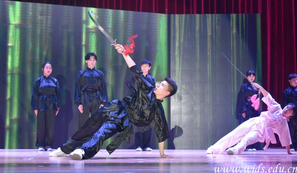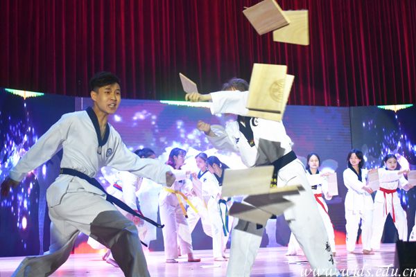 在激昂的音乐中,易玄跆拳道社为观众表演了《跆之魂》,他们精气十足,动作铿锵有力,随着一个个木板应声而碎,赢得了台下观众的阵阵掌声。逍遥武术协会带来了武术表演《侠客行》,动作行云流水,将中国武术的刚柔并济、气势恢宏表演得淋漓尽致。