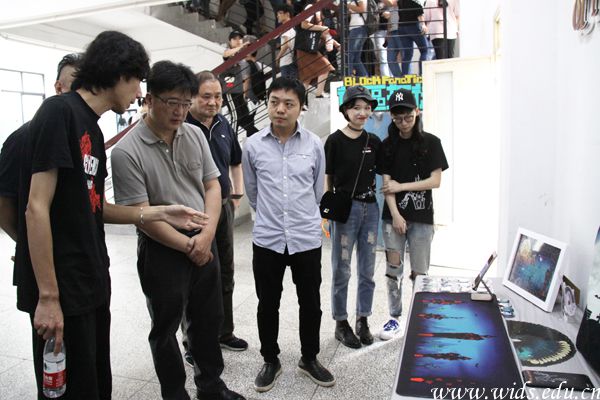 董事长程凡、党委书记刘作清等校领导参观成龙影视传媒学院毕业设计作品展。刘恒 摄