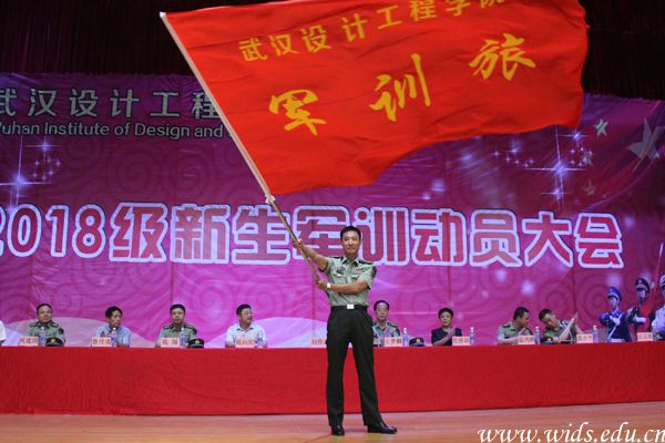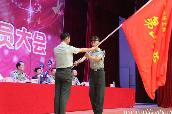 学校党委书记刘作清向威廉体育williamhill军训旅授旗。舒信傲 摄