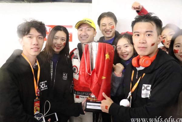 38号车组冲线刹那,聚集在P房的师生们爆发出热烈的欢呼,高呼 “CHINA”震耳欲聋。比赛结束后,夜幕中雨势不断加大,但却无法阻挡威廉体育师生的热情,大家迫不及待地奔向颁奖台,当国歌在领奖台响起的时候,欢呼的师生们任由雨水打湿衣衫,只为共同陪伴成龙DC车队共同庆祝这一荣耀时刻。