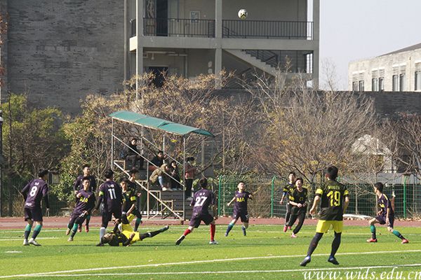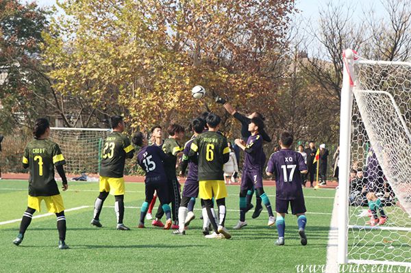 在18日的决赛中,两个学院派出最强阵容上场,开场后,环境设计学院队开球,双方随即展开了激烈地拼抢。比赛进行20分钟后,环境设计学院队控球,多名进攻队员逼近球门,成龙影视传媒学院队的防守队员立即回防。环境设计学院队并没有立即射门,而是不急不燥、稳扎稳打,足球在几个队员的脚上传来传去,突然,27号队员以一记漂亮的射门打破僵局。“球进了”!环境设计学院队夺得了本场比赛的第一分后士气大振,进攻明显加强,但成龙影视传媒学院队也严防死守,双方陷入到紧张的拉锯战中,直至上半场结束,都未能再进一球。