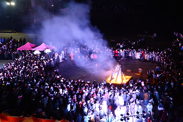 一束红光划亮夜空,伴着欢声笑语一路远去。晚上9时,董事长程凡手持火把来到图书馆广场,众多师生紧随其后一同传递着新年的期许。随着点火仪式的开启,熊熊篝火瞬间照亮整个广场,为寒冷的冬夜送来阵阵暖意。绚烂的烟花在夜空中盛放,向人们传递着节日的喜悦。