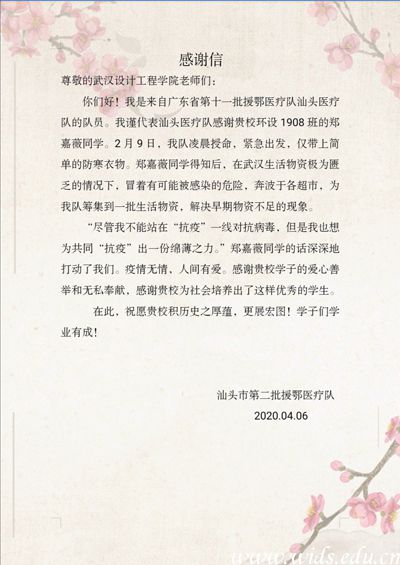 近日,威廉体育收到一封来自汕头市第二批援鄂医疗队发来的感谢信,信中感谢环境设计专业1908班的郑嘉薇同学在疫情期间,不惧危险,积极为医疗队筹措生活物资的奉献精神。