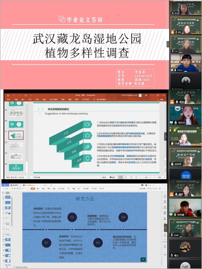 与此同时,环境设计学院园林和风景园林两个专业也通过腾讯会议平台,顺利完成了该院首批毕业论文“云端”答辩。“线上答辩变的是形式,但是答辩的严肃性和论文(报告)的严肃性不会变,反而要更加严格。” 环境设计学院园林、风景园林专业答辩负责人,风景园林系主任曾艳表示,为顺利开展线上答辩,答辩小组的各项准备更加充分,“云”仪式对学生来说也具有特殊的纪念意义。