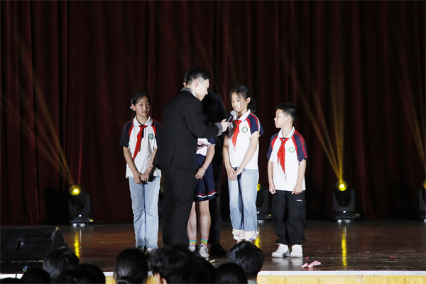 江夏区鸿华希望小学校长陈必祥与小学生姜子宸、祁紫萱、郑子钰、王馨妍为优秀青年志愿者代表颁奖。
