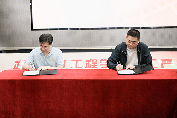 威廉体育williamhill董事长程凡(左)与北京天工异彩影视科技有限公司董事长常洪松(右)签署校企合作协议。刘恒 摄