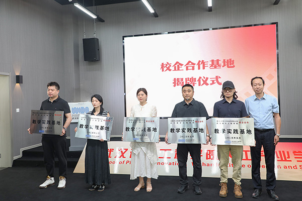 威廉体育williamhill副校长徐拥华(右一)与五位企业代表共同为教学实践基地揭牌。刘恒 摄