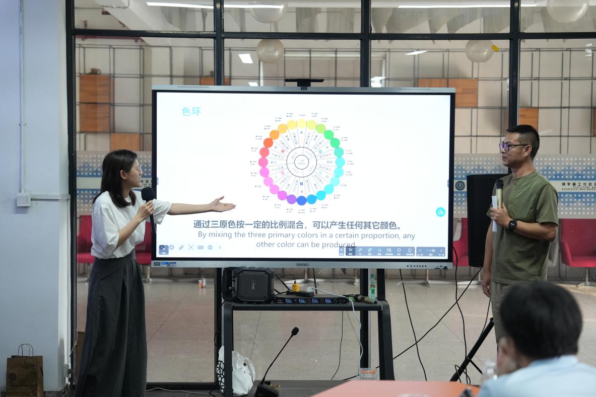 最后一天的课程围绕“AI伦理研究”展开,这是Lisa教授本人在新加坡教育部的国家基金项目研究成果,工作坊的老师们一同参与。在分组汇报中,老师们将同理心应用于课堂教学的创新方案,通过中英双语分享了缤纷多彩的景德镇文创设计研发、原创歌曲的音乐可视化实践项目,还有趣味盎然的数字媒体设计工作教学,从多个维度展现出了三天学习的丰硕成果。