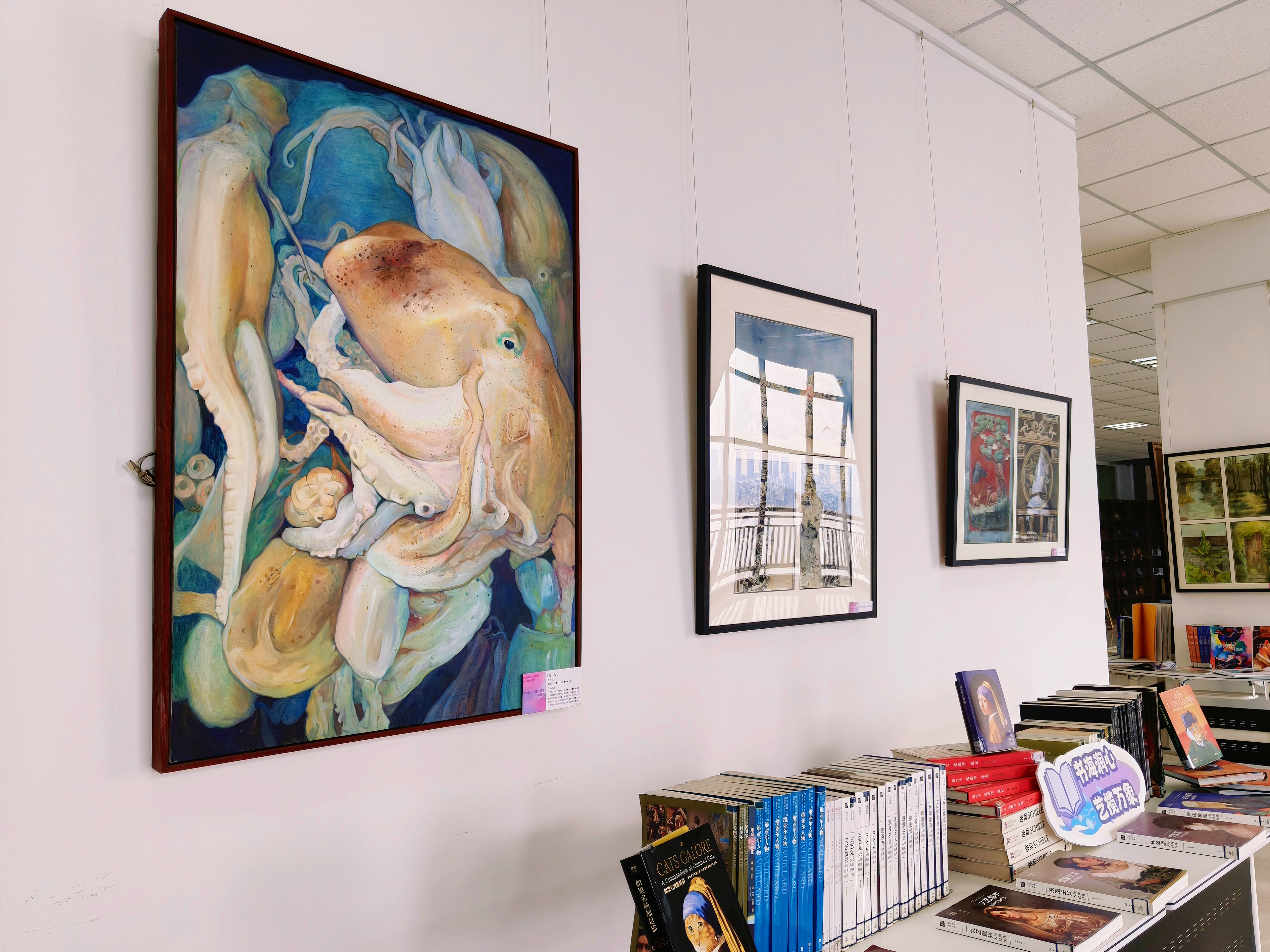 五楼共享空间书画展展出的教师作品。黄佳睿 摄