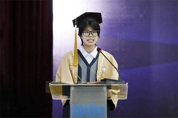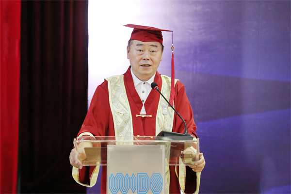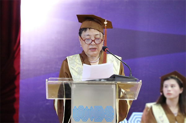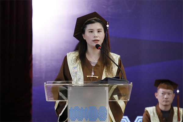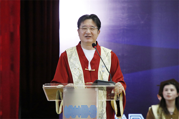 程凡恭贺2025届全体毕业生圆满完成学业、顺利毕业。他在讲话中欣慰地回忆起同学们在毕业大戏中的出色表演,且对参演的毕业生给予高度肯定,回顾了学校首届毕业典礼的盛大场面,还谈到了学校在岁月流转中的不断发展。他向全体毕业生着重介绍了学校自主设计的新版学位服,并以学位服上“代表学校的‘WIDS’徽章”“象征高洁美丽、自由不羁的鹭鸶图案”等,这些承载着学校深厚文化与精神内涵的独特元素,以此满怀深情地呼吁全体师生在未来坚守价值正义,永葆美而自由的精神状态。