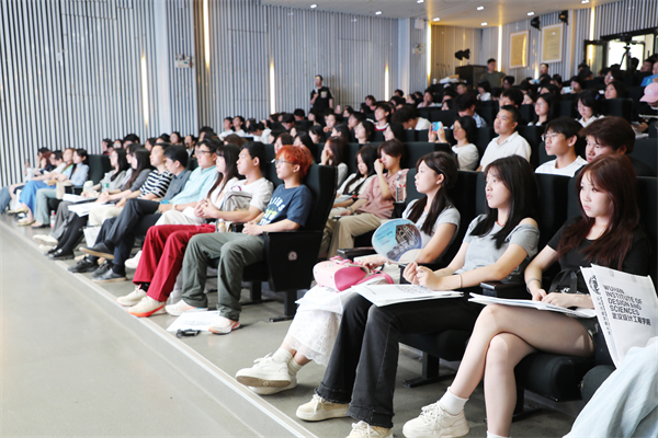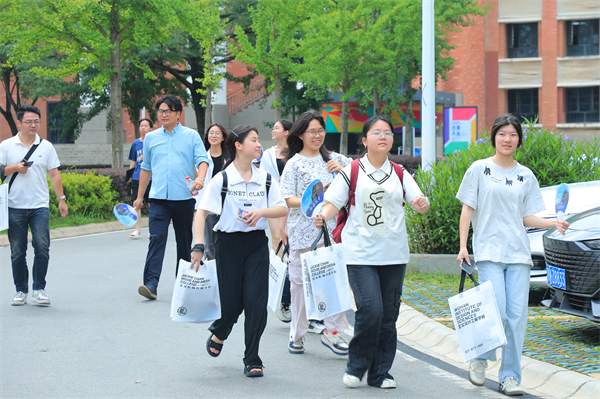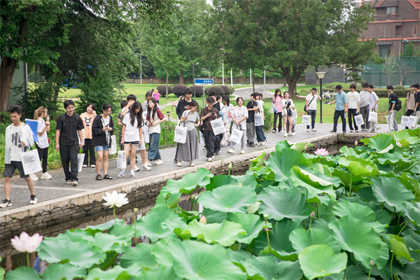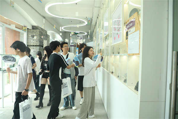 聆听完讲座,考生和家长们在志愿者的带领和引导下漫步校园、有序参观了校园环境和部分教育教学场所。他们走进藏龙美术馆,观摩了“‘二十面体,多维共振’2025优秀毕业设计作品展”,前往临湖轩教学楼,品鉴食品与生物科技学院啤酒生产线酿制的啤酒,观看了亚心护理学院的人体生命科技馆。