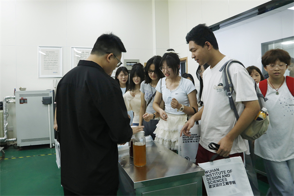 考生们在食品与生物科技学院啤酒生产线观看酿制的啤酒。周佩 摄