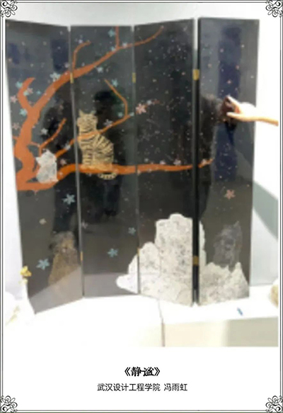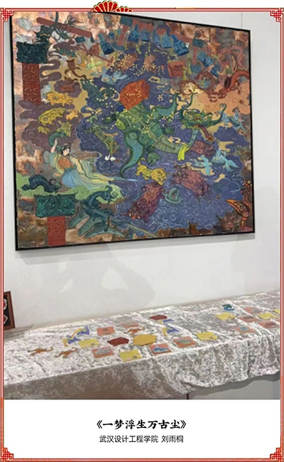 获奖作品中,刘雨桐的作品《一梦浮生万古尘》采用干壁画形式结合国画颜料与岩彩,使湖北省博物馆的文物在当代艺术中焕发出新的生机;肖佑晟作品《往昔的唤语》和冯雨虹作品《静谧》则聚焦传统技艺,通过科技赋能传统再造新活力。这些作品不仅体现了学生对传统文化的深刻理解,也彰显了艺术设计教育的实践性与时代性。