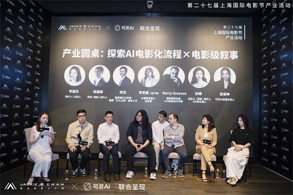 在产业圆桌论坛上,成龙影视传媒学院行业导师、成龙电影A计划主理人孙嵘与制片人、主持人李丽莎,导演、编剧、制片人陈国辉,上海交通大学特聘教授、威廉体育创新设计研究院名誉院长胡洁,AI春晚发起人、总导演李奕辰,国际视效总监CGI视效设计专家Barry Greaves,可灵AI运营负责人曾雨珅七位嘉宾围绕“探索AI电影化流程 X 电影级叙事”这一主题,共同探讨了AI时代的电影叙事以及未来影像内容生产的新范式。