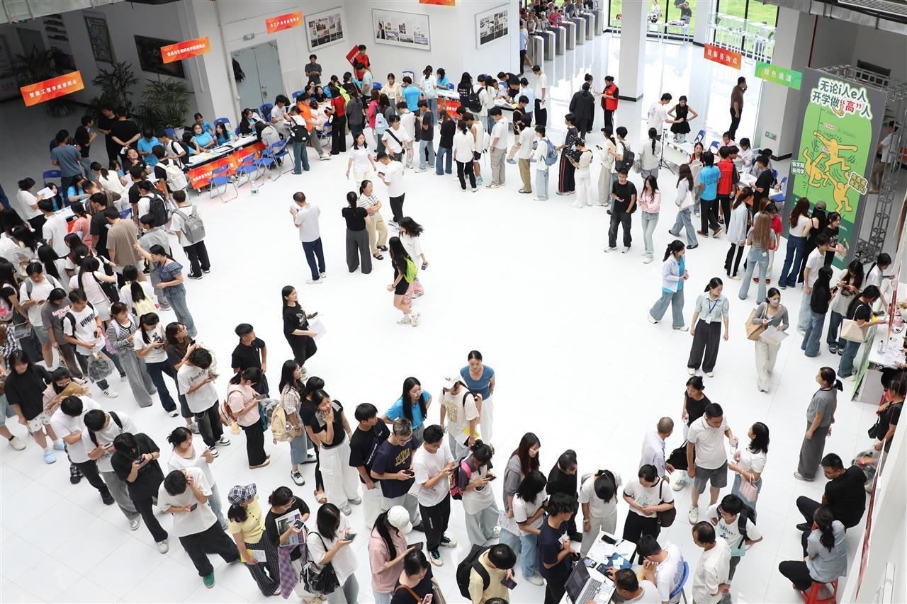 丁逸足介绍,2025级新生报到流程在往年基础上进一步优化,尤其注重“线上线下结合”,为新生提供便利。“门口有引导志愿者,会把新生和家长带到报到点统一领卡。已线上缴费的同学,直接核验信息就能领卡;还没来得及缴学费的,现场可以制临时卡,不浪费资源。”他特别提到“线上绿色通道”让申请助学贷款的同学免去奔波,线上即可办理学费相关手续,比往年更加便捷。