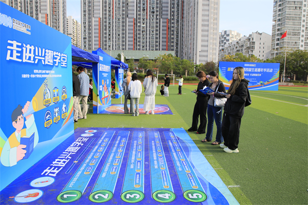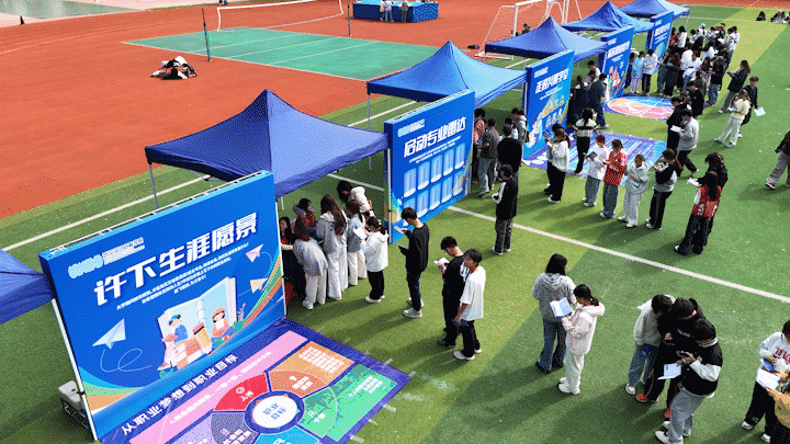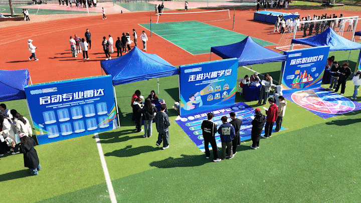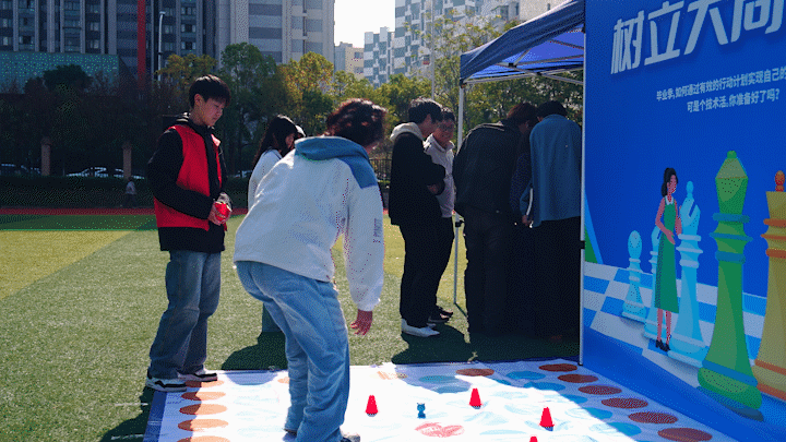 上午10时,足球场上人头攒动,处处洋溢着热烈而欢快的氛围。同学们手持“生涯探索地图”活动手册,穿梭在各项目处,在轻松愉悦的游戏互动“打卡”中,悄然完成了一场对自我认知、学业规划与职业探索的深度之旅。