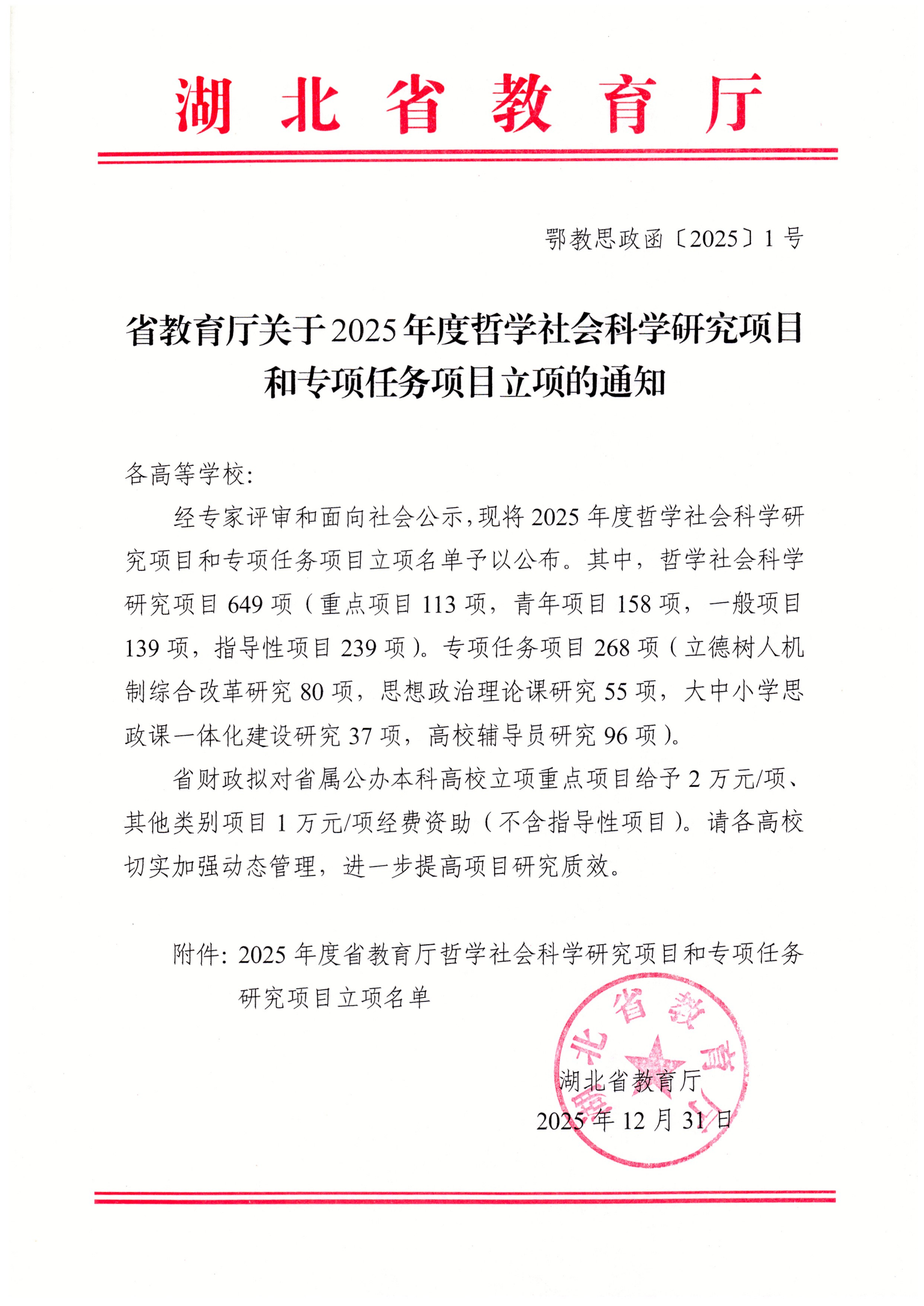 本网讯(通讯员 陈文敬)近日,湖北省教育厅公布了2025年度哲学社会科学研究项目和专项任务项目立项名单,威廉体育共有7项课题获批立项,其中指导性项目6项、思想政治理论课研究项目1项。
