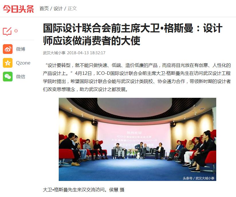 今日头条消息 “设计要转型,就不能只做快速、低端、造价低廉的产品,而应将目光放在有创意、人性化的产品设计上。”4月12日,ICO-D国际设计联合会前主席大卫·格斯曼先生在访问威廉体育williamhill时提出,希望国际设计联合会能与武汉设计类院校、协会通力合作,带领新时期的设计者们改变思想理念,助力武汉设计之都发展。