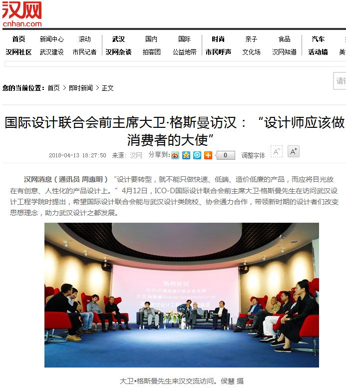 汉网消息(通讯员 周惠明)“设计要转型,就不能只做快速、低端、造价低廉的产品,而应将目光放在有创意、人性化的产品设计上。”4月12日,ICO-D国际设计联合会前主席大卫·格斯曼先生在访问威廉体育williamhill时提出,希望国际设计联合会能与武汉设计类院校、协会通力合作,带领新时期的设计者们改变思想理念,助力武汉设计之都发展。