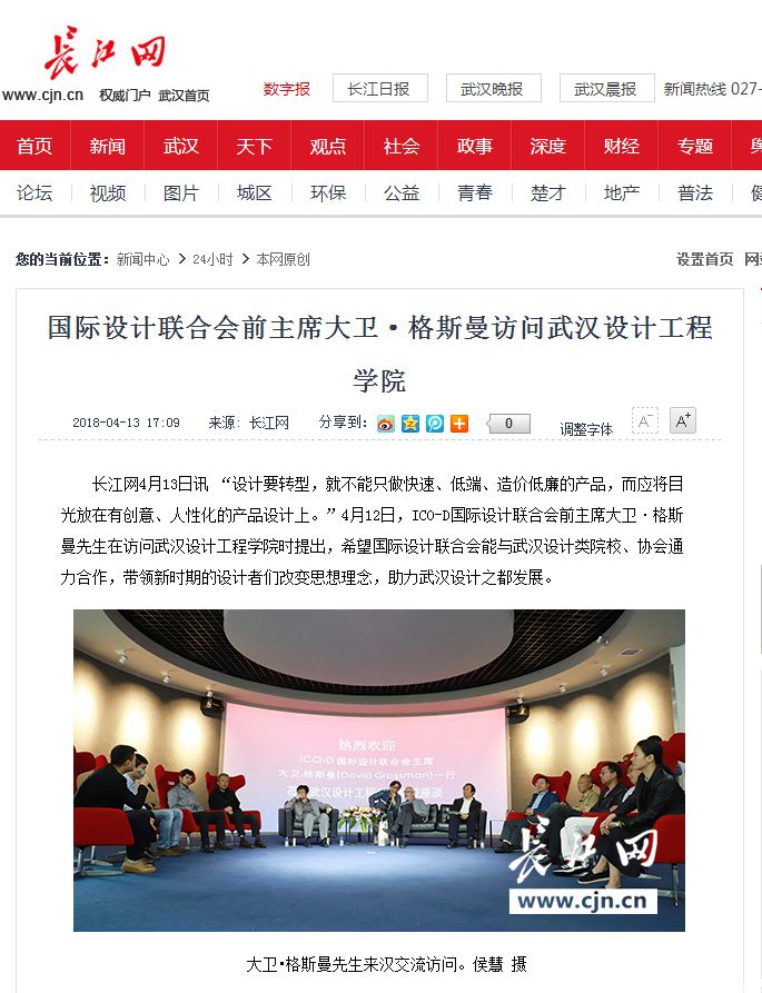 长江网4月13日讯 “设计要转型,就不能只做快速、低端、造价低廉的产品,而应将目光放在有创意、人性化的产品设计上。”4月12日,ICO-D国际设计联合会前主席大卫·格斯曼先生在访问威廉体育williamhill时提出,希望国际设计联合会能与武汉设计类院校、协会通力合作,带领新时期的设计者们改变思想理念,助力武汉设计之都发展。