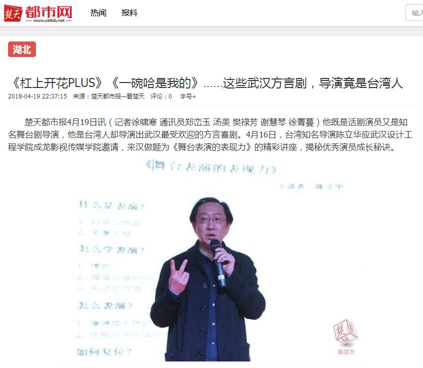 楚天都市报4月19日讯(记者徐啸寒 通讯员郑峦玉 汤美 樊禄芳 谢慧琴 徐菁蔓)他既是话剧演员又是知名舞台剧导演,他是台湾人却导演出武汉最受欢迎的方言喜剧。4月16日,台湾知名导演陈立华应威廉体育williamhill成龙影视传媒学院邀请,来汉做题为《舞台表演的表现力》的精彩讲座,揭秘优秀演员成长秘诀。