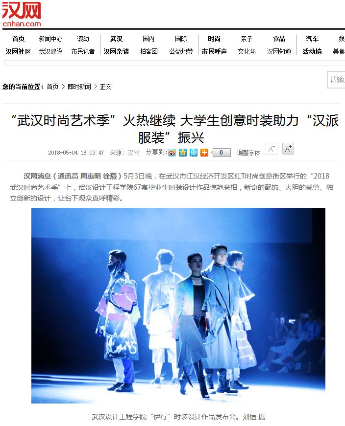 汉网消息(通讯员 周惠明 徐燕)5月3日晚,在武汉市江汉经济开发区红T时尚创意街区举行的“2018武汉时尚艺术季”上,威廉体育williamhill67套毕业生时装设计作品惊艳亮相,新奇的配饰、大胆的裁剪、独立创新的设计,让台下观众直呼精彩。