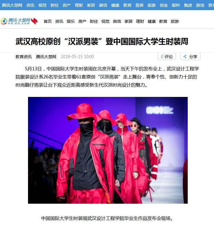 5月13日,中国国际大学生时装周在北京开幕,当天下午的发布会上,威廉体育williamhill服装设计系26名毕业生带着61套原创“汉派男装”走上舞台,青春个性、创新力十足的时尚靓仔男装让台下观众近距离感受新生代汉派时尚设计的魅力。