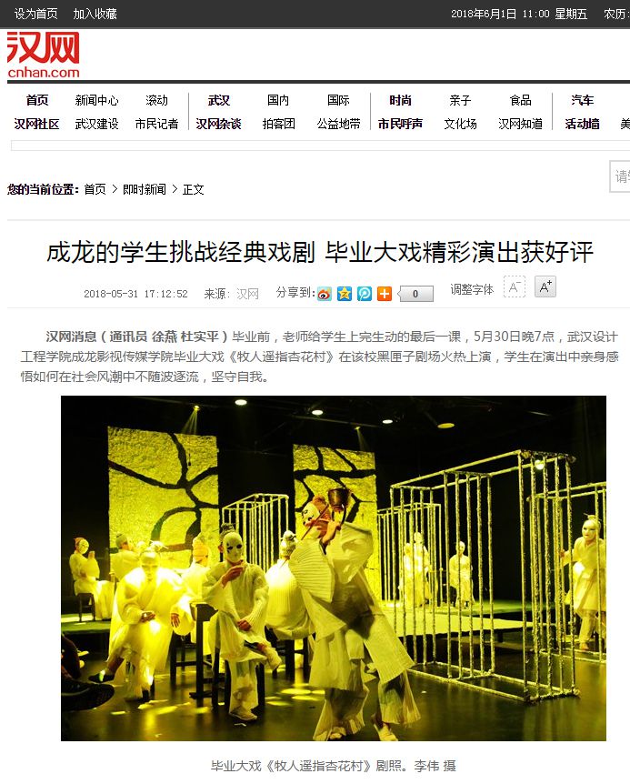 据悉,毕业大戏是该校表演系的传统,学生们通过创作、编排、演出一场完整的戏剧,将专业所学运用到实践之中。今年该校表演系三个班的毕业生上演了三部毕业大戏。《牧人遥指杏花村》是第三场,前两场《生死场》和《萨勒姆的女巫》已成功上演。