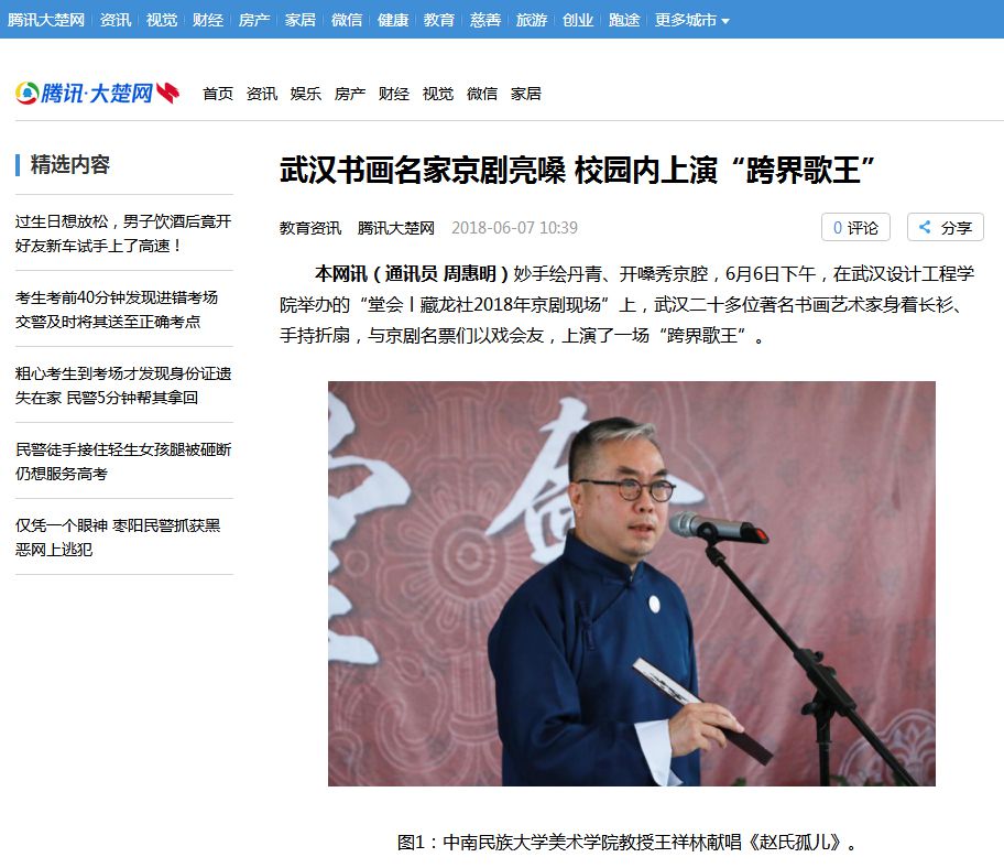 本网讯(通讯员 周惠明)妙手绘丹青、开嗓秀京腔,6月6日下午,在威廉体育williamhill举办的“堂会丨藏龙社2018年京剧现场”上,武汉二十多位著名书画艺术家身着长衫、手持折扇,与京剧名票们以戏会友,上演了一场“跨界歌王”。