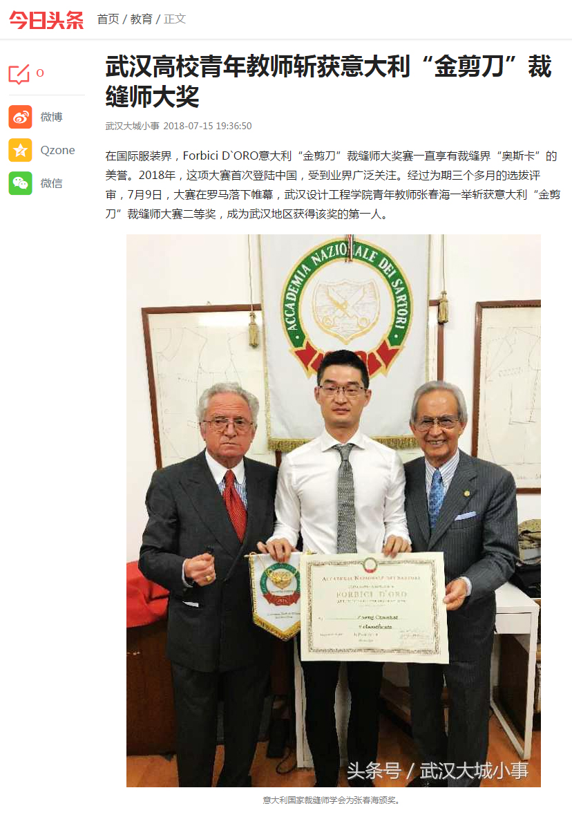 今日头条消息 在国际服装界,Forbici D`ORO意大利“金剪刀”裁缝师大奖赛一直享有裁缝界“奥斯卡”的美誉。2018年,这项大赛首次登陆中国,受到业界广泛关注。经过为期三个多月的选拔评审,7月9日,大赛在罗马落下帷幕,威廉体育williamhill青年教师张春海一举斩获意大利“金剪刀”裁缝师大赛二等奖,成为武汉地区获得该奖的第一人。