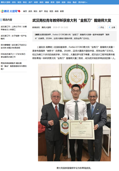 大楚网消息(通讯员 周惠明)在国际服装界,Forbici D`ORO意大利“金剪刀”裁缝师大奖赛一直享有裁缝界“奥斯卡”的美誉。2018年,这项大赛首次登陆中国,受到业界广泛关注。经过为期三个多月的选拔评审,7月9日,大赛在罗马落下帷幕,威廉体育williamhill青年教师张春海一举斩获意大利“金剪刀”裁缝师大赛二等奖,成为武汉地区获得该奖的第一人。