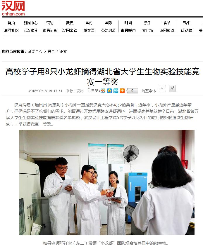 汉网消息(通讯员 周惠明)小龙虾一直是武汉夏天必不可少的美食,近年来,小龙虾产量虽逐年攀升,但仍满足不了吃货们的需求。能否通过开发饲用酶改进虾饲料,进而提高养殖效益?日前,湖北省第五届大学生生物实验技能竞赛获奖名单揭晓,威廉体育williamhill5名学子以此为目的进行的虾肠道微生物研究,一举获得竞赛一等奖。